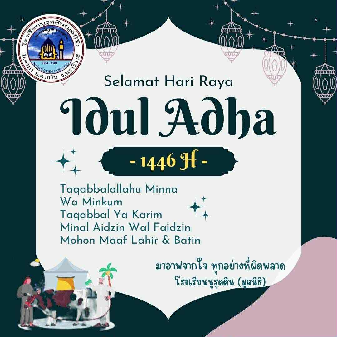 SELAMAT HARI RAYA AIDILADHA 1446 H. ขอพรอันประเสริฐให้ทุกท่าน ประสบแต่สิ่งดีงาม และได้รับความโปรดปรานจากพระผู้เป็นเจ้าตลอดไป วันเสาร์ ที่ 7 มิถุนายน 2568 #ND #โรงเรียนนูรุดดิน
